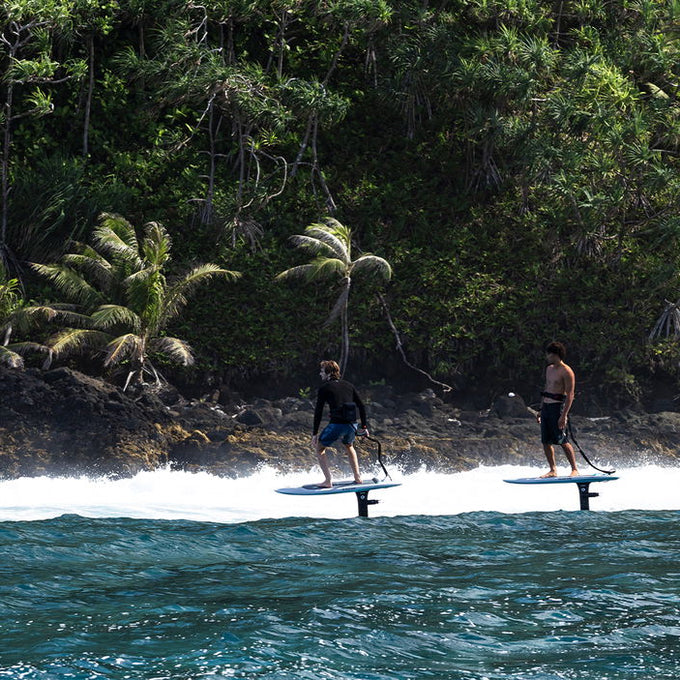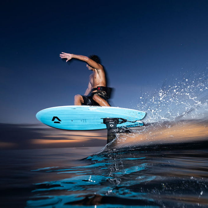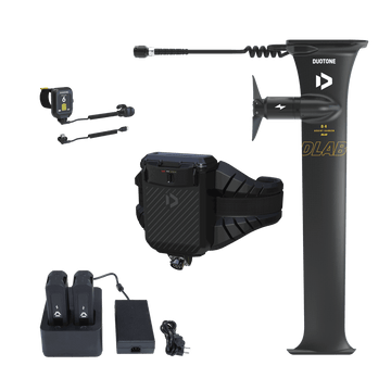 El Foil Assist funciona con dos baterías compactas alojadas en una caja estanca montada en un arnés ultraligero (aprox. 3,76 kg). Esto mantiene tu tabla libre de peso y drag adicionales. Con las baterías colocadas en tus caderas, se conserva la sensación natural y fluida del foiling, sin limitar tu libertad de movimiento. El eHarness es flotante y fácil de quitar. Un cable recorre discretamente el leash corto de la tabla y conecta las baterías con el eMast. El receptor integrado en la caja de la batería garantiza una conexión estable y fiable entre el control remoto y el motor durante toda la sesión.
