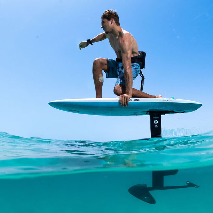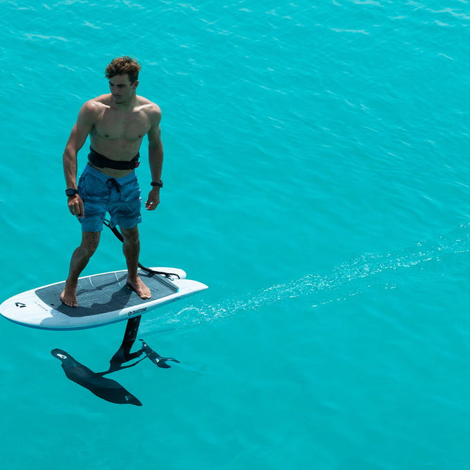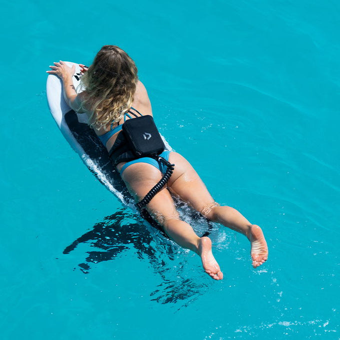 El Foil Assist funciona con dos baterías compactas alojadas en una caja estanca montada sobre un eHarness ultraligero (aprox. 3,76 kg). Esto mantiene tu tabla libre de peso adicional y resistencia. Al llevar las baterías en las caderas, se conserva la sensación natural y fluida del foiling, sin restringir tu libertad de movimiento. El eHarness es flotante y fácil de quitar. Un cable recorre discretamente el leash más corto de la tabla y conecta las baterías con el eMast. El receptor integrado en la caja de la batería garantiza una conexión estable y fiable entre el mando y el motor durante toda la sesión.