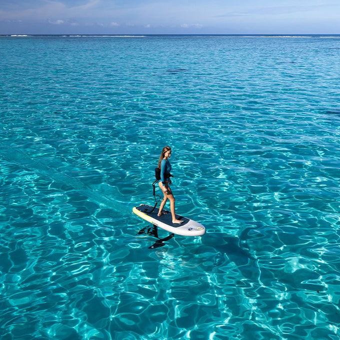 El Foil Assist Remote, un controlador impermeable estilo smartwatch con un anillo para el dedo, mantiene tus manos libres y facilita remar o impulsarte sobre la tabla. Activa el motor con un doble clic en el botón +, y controla la velocidad manteniendo presionado el botón + o –.