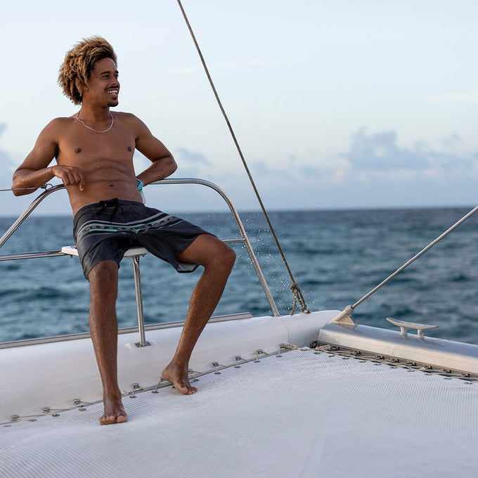 Bañador de color gris oscuro con un moderno estampado. Este bañador no solo luce genial, sino que está fabricado con un material elástico que permite la máxima libertad de movimiento.