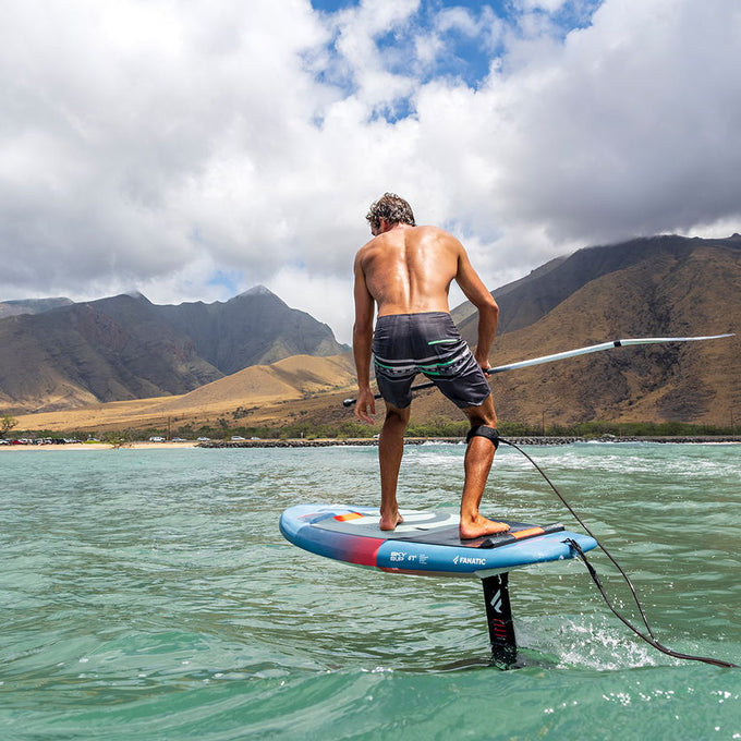 The recessed deck shape provides more stability and more direct foil control, early flight and maximum leverage during pumping and turns. The new beveled rails provide a faster water break during turns. A small front fin facilitates straight paddling through the lineup and keeps the board on track while riding waves.